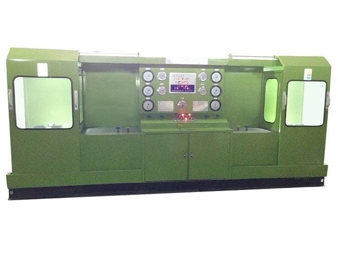 本機由液壓系統(tǒng)、機械部件,電器控制及多極氣源升壓裝置系統(tǒng)等部件組成。液壓系統(tǒng)是本試驗臺的動力主源。用于各類液壓缸和機械件驅動執(zhí)行功能。試驗面夾爪由液壓缸直接驅動執(zhí)行,軸向夾緊壓力是按閥門試驗壓力等級不同進行調節(jié)增壓(最高液壓增壓壓力31 5MPa)。各夾爪受力均,夾緊可靠。徑向移動由液壓缸傳動執(zhí)行,各夾爪進退同步,靈活自如,確保通徑大小不同閥門的測試。多極氣源升壓裝置是利用液氣聯(lián)動增壓。增壓范圍0.6—32 0MPa,用于閥門介質壓力試驗。氣源升壓工作設有自動和手控二種操作選擇,當選用自動升壓工作時,工作人員可以近距離離開操縱臺觀察現(xiàn)場試驗情況。