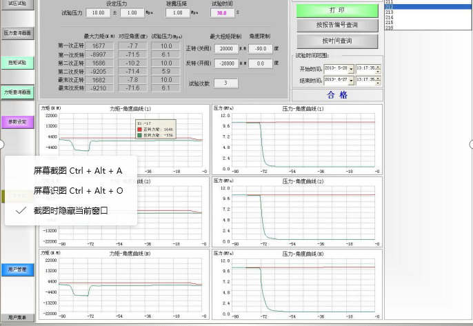 3、在進行閥門”啟閉扭矩測試”時,該裝置以液壓能為動力,液壓馬達產(chǎn)生可控可調(diào)的扭矩,通過扭矩傳感器和萬向節(jié)傳動桿,將扭矩傳至被測閥門,在被測閥門帶壓關(guān)閉或帶壓開啟時,啟閉閥門的扭矩由扭矩傳感器檢出信號,傳至“觸摸屏監(jiān)測系統(tǒng)”,系統(tǒng)實時地將檢測全過程的扭矩值,以曲線的形式,顯示和儲存在系統(tǒng)中,同時在系統(tǒng)中顯示最大的扭矩力,通過關(guān)鍵字,可檢索、查閱和打印扭矩檢測的數(shù)據(jù)和曲線。